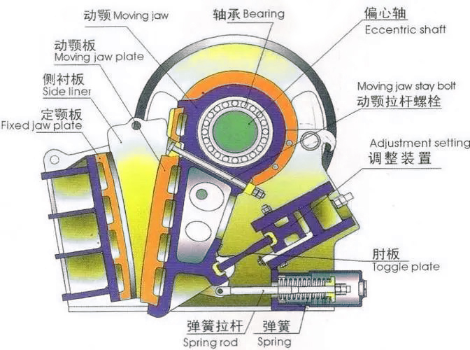 動顎上端直接懸掛在偏心軸上,作為曲柄連桿機構的連桿,由偏心軸的偏心直接驅動,動顎的下端鉸連著推力板支撐到機架的后壁上。當偏心軸旋轉時,動顎上各點的運動軌跡是由懸掛點的圓周線,逐漸向下變成橢圓形,越向下部,橢圓形越偏,直到下部與推力板連接點軌跡為圓弧線。由于這種機械中動顎上各點的運動軌跡比較復雜,故稱為復擺式顎式破碎機。工作時,電動機通過皮帶輪帶動偏心軸旋轉,使動顎周期性地靠近、離開定顎,從而對物料有擠壓、搓碾等多重破碎,使物料由大變小,逐漸下落,直至從排料口排出。