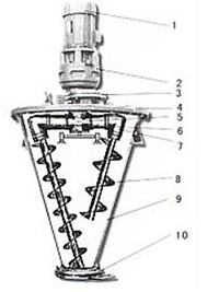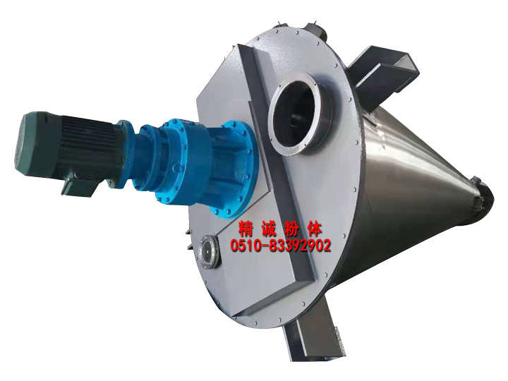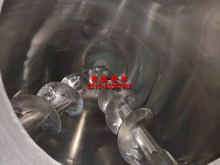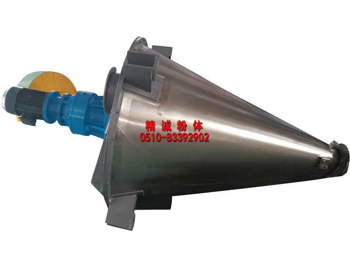 雙螺旋錐形混合機(雙螺旋混合機)的攪拌部件為兩條不對稱懸臂(轉臂),不同長度,它們環繞錐形容器的中心軸軸線轉動(公轉)的同時,還借助轉臂下方兩根螺旋做自轉運動,該設備通過懸臂與螺旋的公、自轉使物料反復提升實現混合目的。